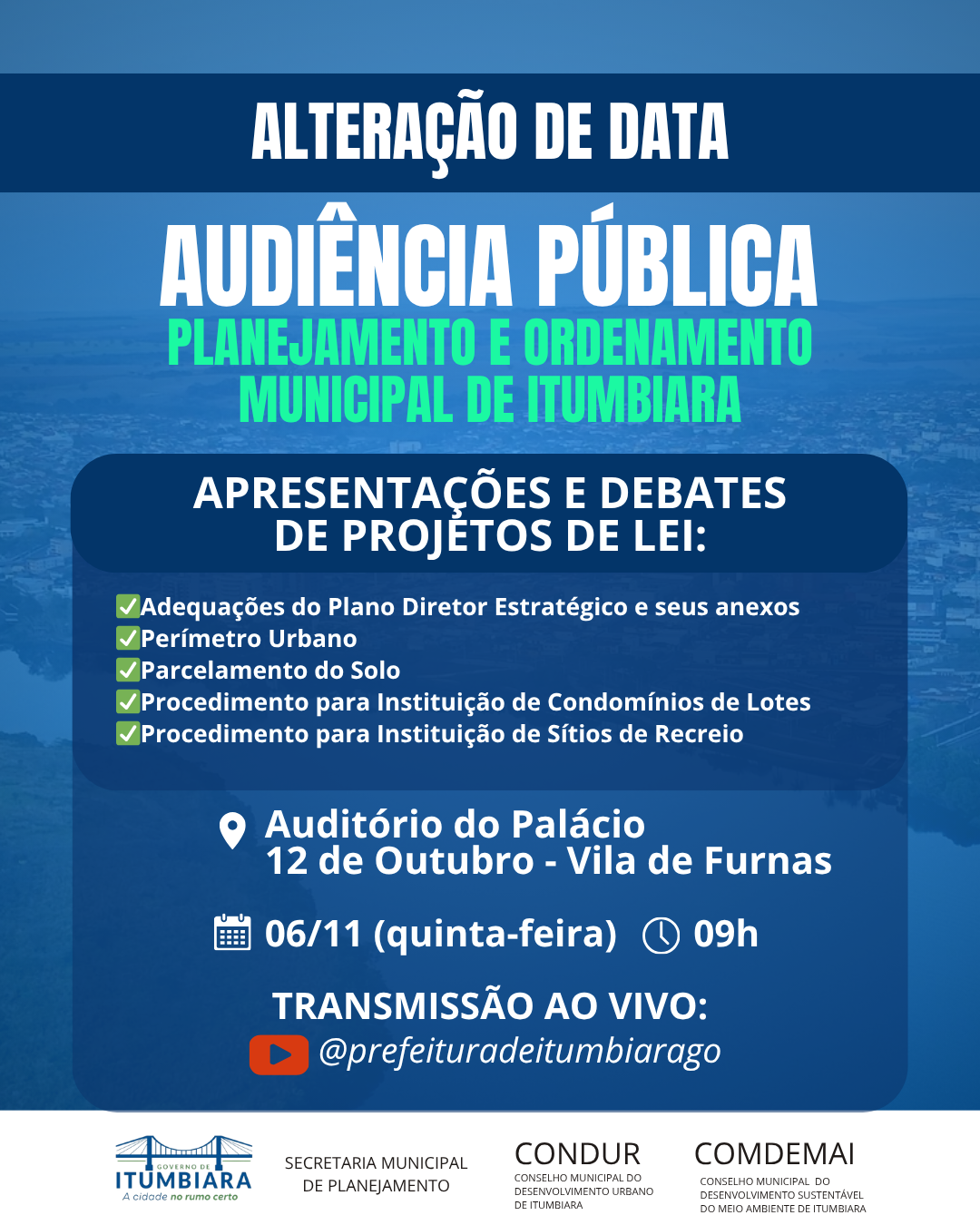 AUDIÊNCIA PÚBLICA SOBRE ADEQUAÇÕES NO PLANO DIRETOR TRANSFERIDA PARA 5 DE NOVEMBRO