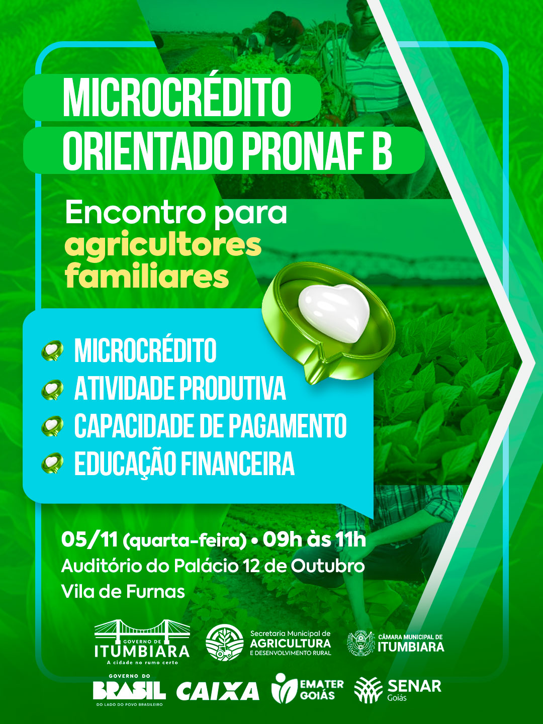 A Prefeitura de Itumbiara, por meio da Secretaria Municipal de Agricultura, convida todos os agricultores familiares para o Encontro sobre Microcrédito Orientado PRONAF B. 💰🌾