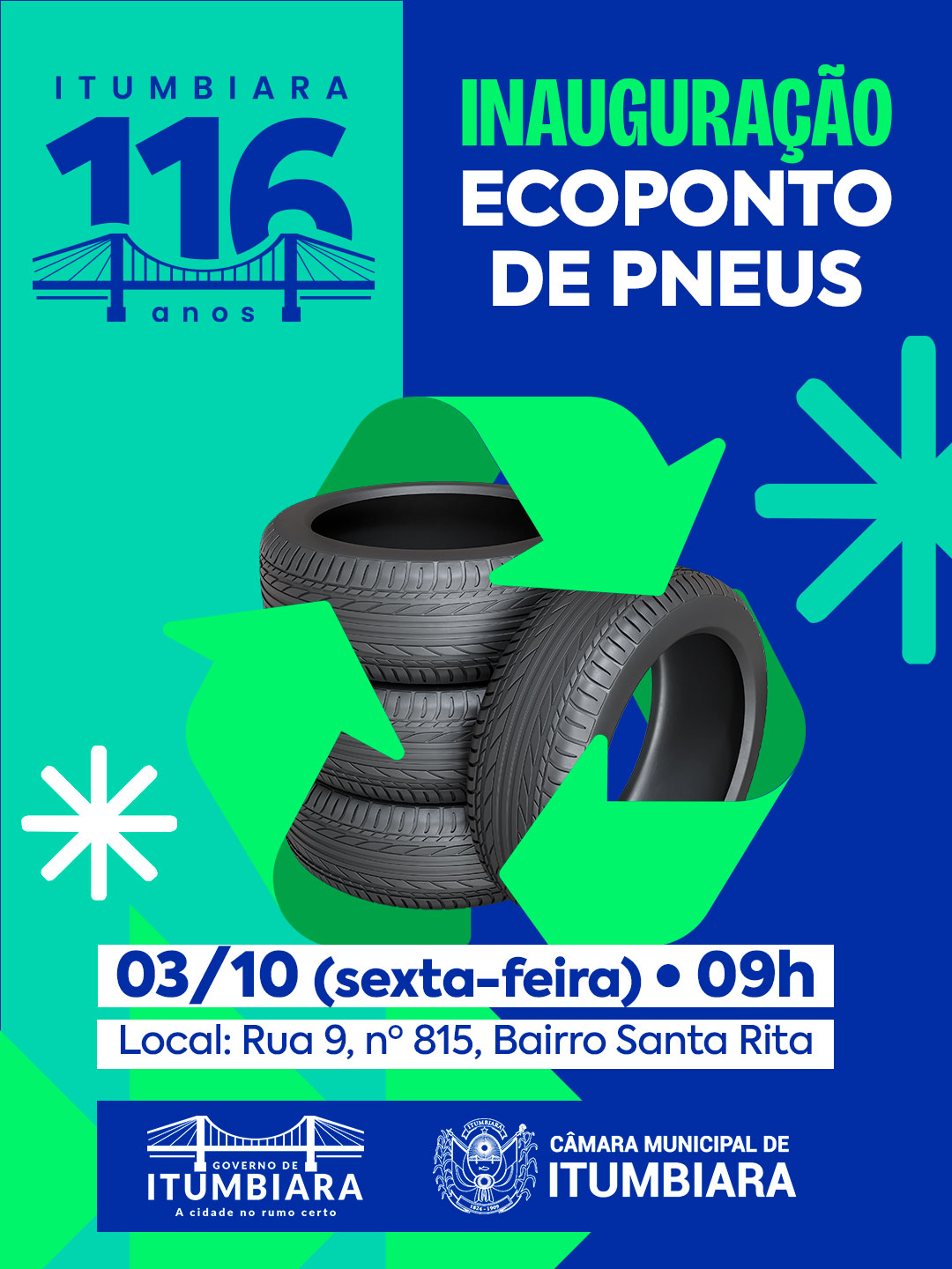 Nesta sexta-feira (03/10), às 09h, vamos inaugurar o Ecoponto de Pneus em Itumbiara, localizado na Rua 9, nº 815, Bairro Santa Rita.