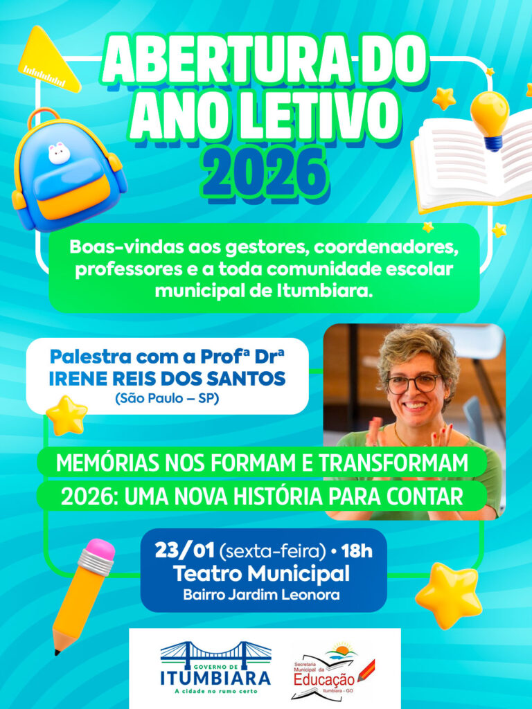 As aulas na rede municipal de Itumbiara começarão na próxima segunda-feira, dia 26 de janeiro. Mas, nesta sexta, dia 23, será realizado o evento de abertura do ano letivo de 2026, com a participação do prefeito Dione Araújo, da secretária municipal da Educação, Silvana Matos, da equipe da Secretaria, gestores, coordenadores e professores das escolas, CMEI’s (centros municipais de educação infantil) e CMETI’s (centros municipais de educação em tempo integral) da cidade.