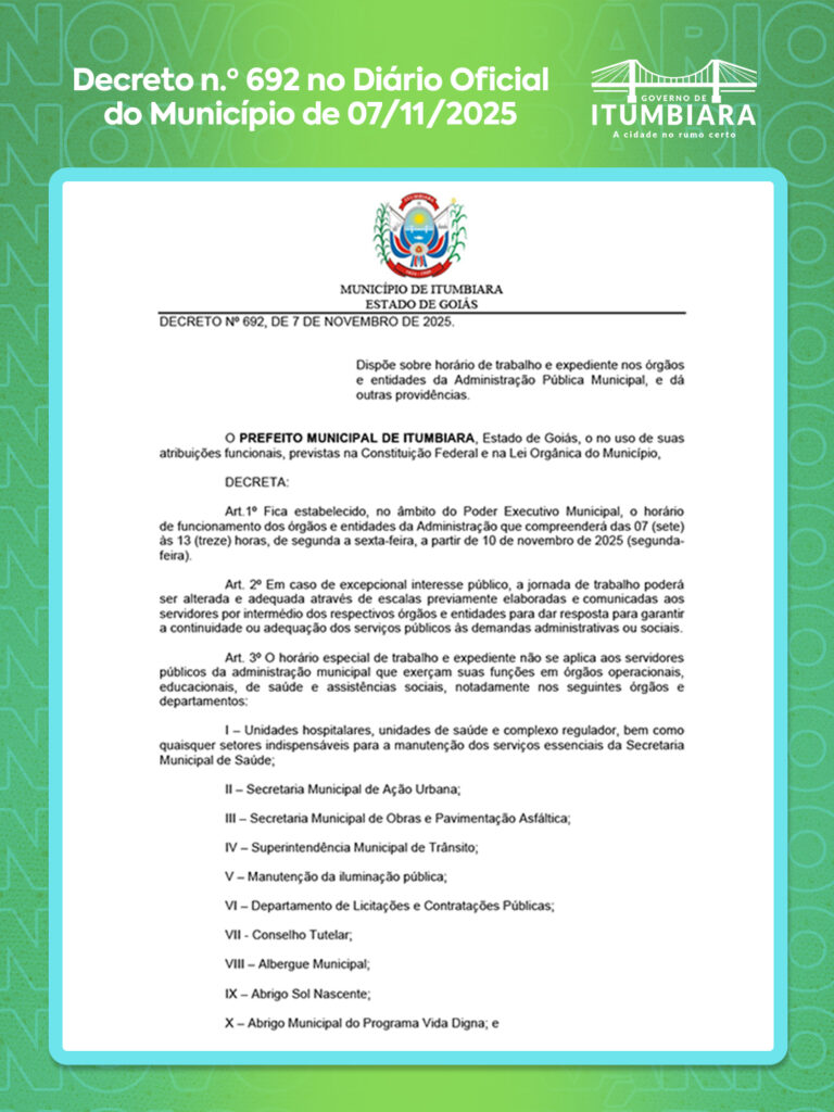 O decreto n.º 692, de 7 de novembro de 2025, que regulamenta o novo horário, foi publicado nesta sexta-feira, dia 7, no Diário Oficial do Município e está disponível no site itumbiara.go.gov.br .