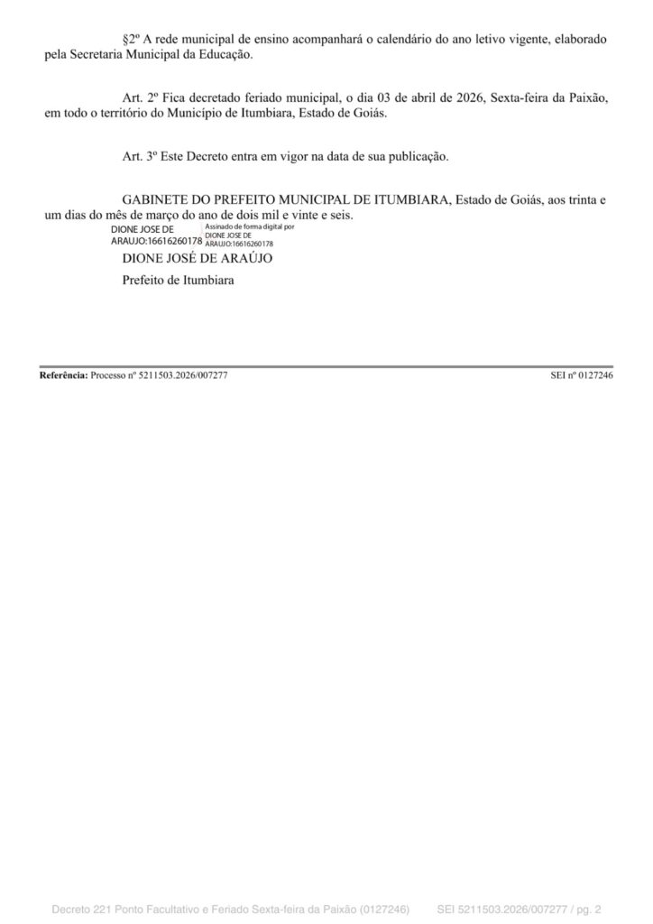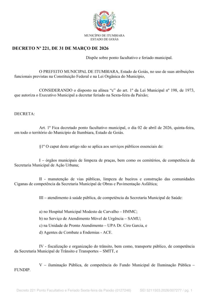 O decreto n.º 221/2026, sobre este ponto facultativo e feriado da Sexta-feira da Paixão, foi publicado no Diário Oficial do Município, na edição extraordinária 4595 desta quarta-feira, dia 1º de abril, e está disponível no site da Prefeitura de Itumbiara, itumbiara.go.gov.br .