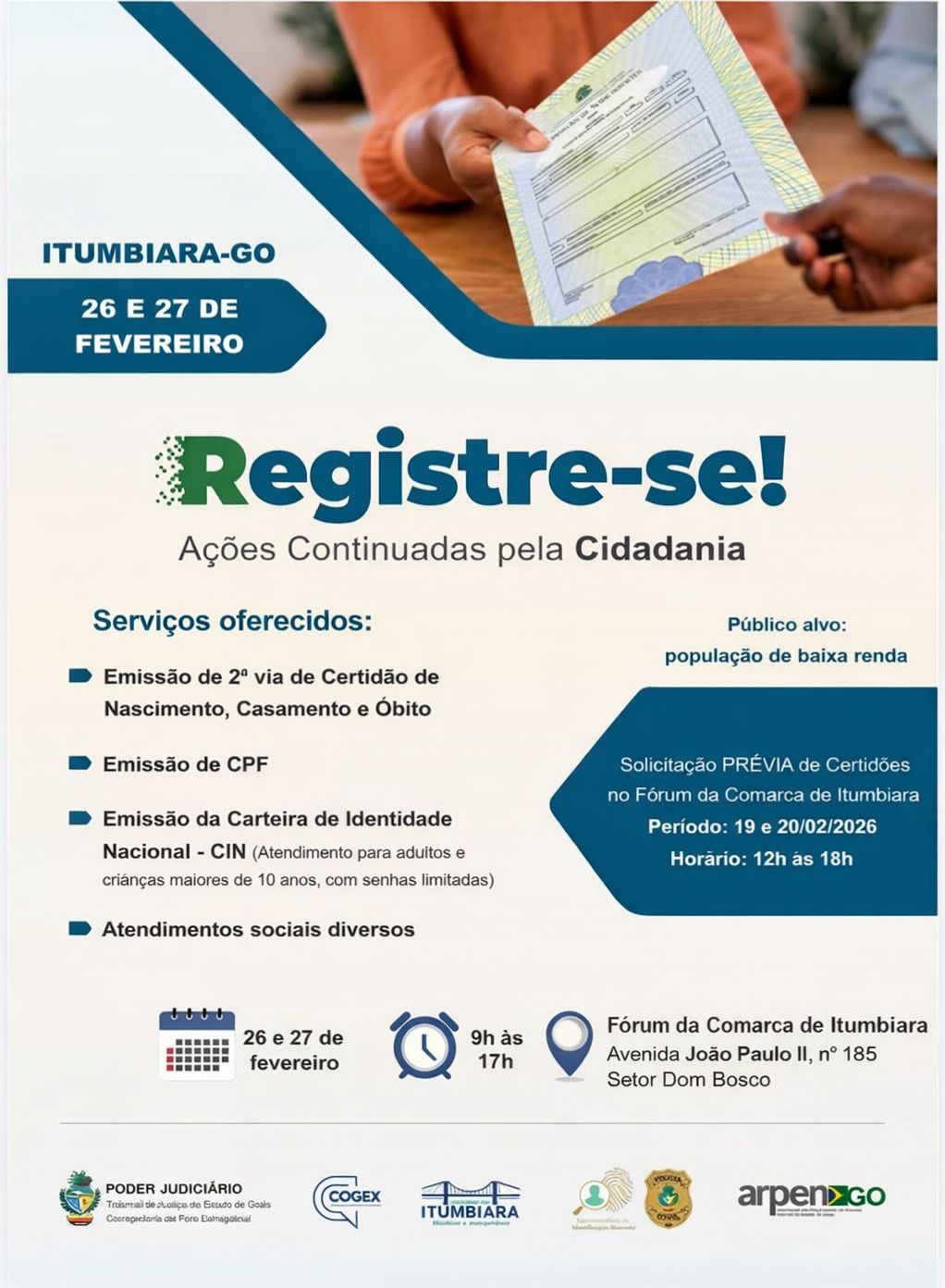 REGISTRE-SE: AÇÕES DE CIDADANIA EM ITUMBIARA, EM FEVEREIRO