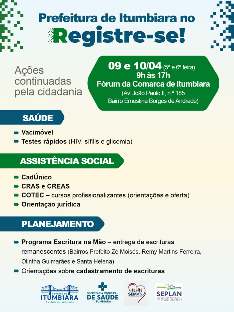 Nos dias 09 e 10 de abril, a população de Itumbiara terá acesso a diversos serviços gratuitos, reunidos em um só lugar!